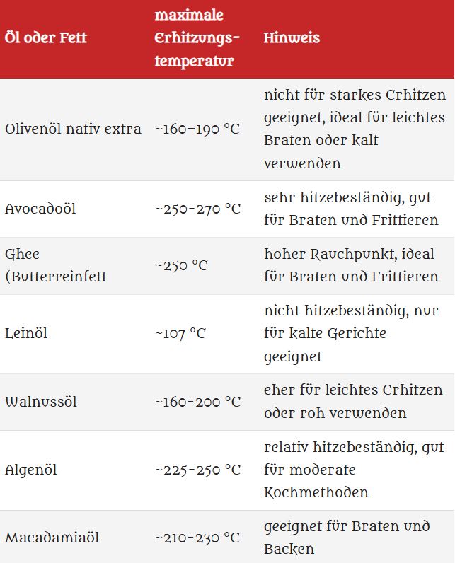 | Öl oder Fett | maximale Erhitzungs-temperatur | Hinweis |
